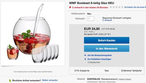 Eine Bowle ist ein Highlight bei jeder Gartenparty, Silvester und anderen Festen. Dieses Bowlenset in WMF Qualität besteht aus: 1x Bowlenschale (4,3 L), 1x Schöpflöffel, 6x Bowlengläser (0,35 L). 4,5 Sterne bei Amazon.