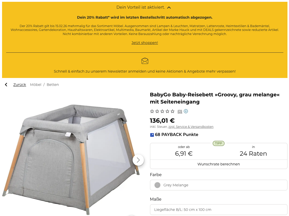 Das BabyGo Baby-Reisebett »Groovy Grau Melange« mit Seiteneingang bekommt man im Laufe dieser Aktion für 108,81€ zzgl. 5,95€ Versand.