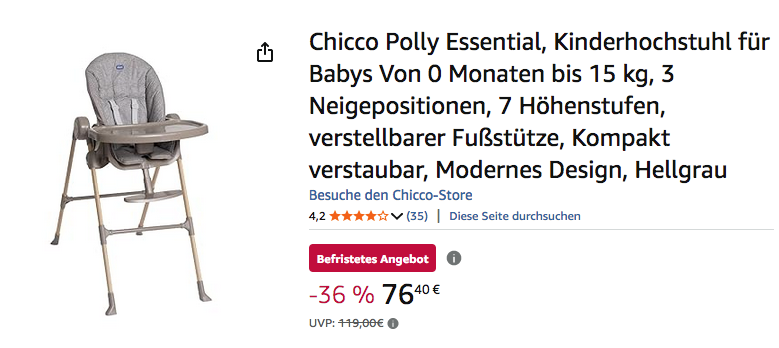Amazon bietet aktuell den Chicco Polly Essential Kinderhochstuhl in Hellgrau für 76,40€ an, solange der Vorrat reicht.
