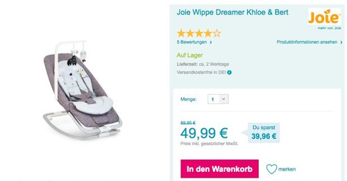 Babymarkt.de bietet heute, 06.01.18, als Tagesangebot die Joie Wippe Dreamer Khloe & Bert für 49,99€ an. Eine Babywippe kann nicht nur zur Pflege und zum Füttern des Babys benutzt werden, sondern auch, wenn das Baby in der Nähe der Eltern bleiben muss und nicht auf dem Boden liegt kann (z.B. beim Kochen in der Küche).Joie Wippe Dreamer Khloe & Bert:Ultraflach zusammenklappbar, leichtgewichtig und einfach zu transportieren 5 klassische Schlaflieder und 5 Naturgeräusche Beruhigende Vibration mit 2 Intensitätsstufen 3-fach verstellbarer Neigungswinkel der Sitzeinheit 3-fach höhenverstellbarer 3-Punkt Sicherheitsgurt mit SoftTouch-Polsterung Pflegeleichte Bezüge, schadstoffgeprüft und bei 30°C waschbar