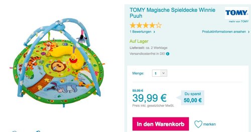 Babymarkt.de bietet heute, 09.01.18, als Tagesangebot die Winnie Puuh - Magische Spieldecke von TOMY für 39,99€ inkl. Versand an. Eine Spieldecke mit Rundbögen und Spielfiguren fördert und regt die Motorik und alle Sinne des Babys an. TOMY Magische Spieldecke Winnie Puuh: 7 Lustige Spielmöglichkeiten und Musik unterhalten dein Baby 3 ablösbare, Rasselnde Spielzeugfiguren machen Spaß und wecken die Entdeckungslust deines Kindes Raschelnde Stellen auf der Spielbogendecke stimulieren alle Sinne deines Babys Mit Sounds Batterien: 3 x AA-Batterien (LR06). Diese sind im Lieferumfang enthalten Maße: 76 x 76 x 48 cm Diese Spieldecke wurde von Amazon Kunden mit sehr guten 4,3 Sternen benotet (3 Kundenrezensionen).