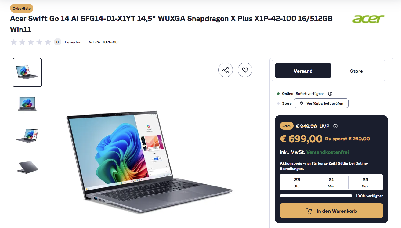 Cyberport bietet bis zum 24.10.25 9 Uhr im Laufe der BlackCyberDeals - Aktion das Acer Swift Go 14 AI SFG14-01-X1YT 14,5" Notebook - ein schnelles Office-Notebook mit langem Akkubetrieb - für 699€ inkl. Versand an, solange der Vorrat reicht.