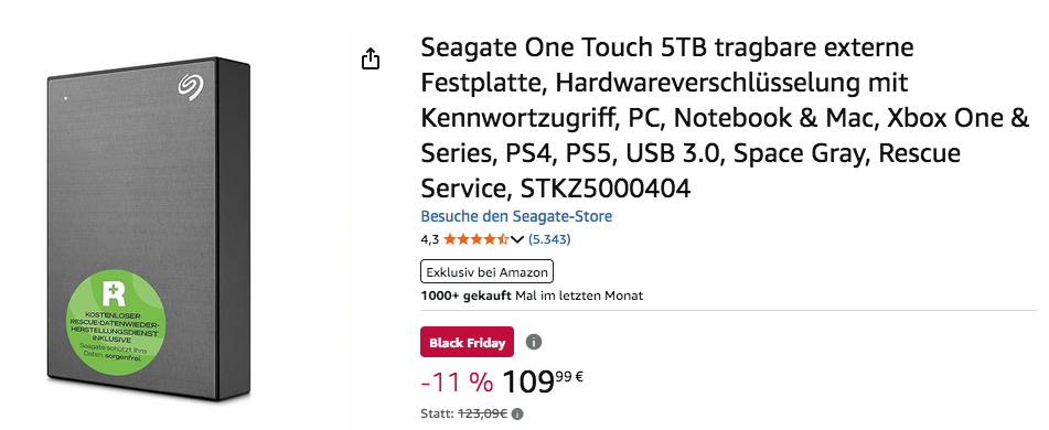 Die Seagate STKZ5000404 One Touch 5TB externe Festplatte bekommt man im Laufe dieser Aktion für 109,99€.
