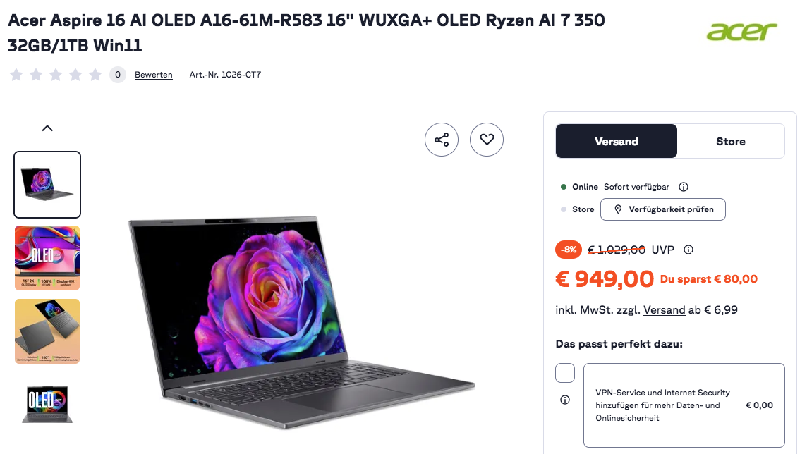 Das Acer Aspire (NX.JP0EG.00J ) 16 AI OLED 16" 32GB/1TB Notebook bekommt man im Laufe dieser Aktion für 949€ zzgl. 6,99€ Versand.