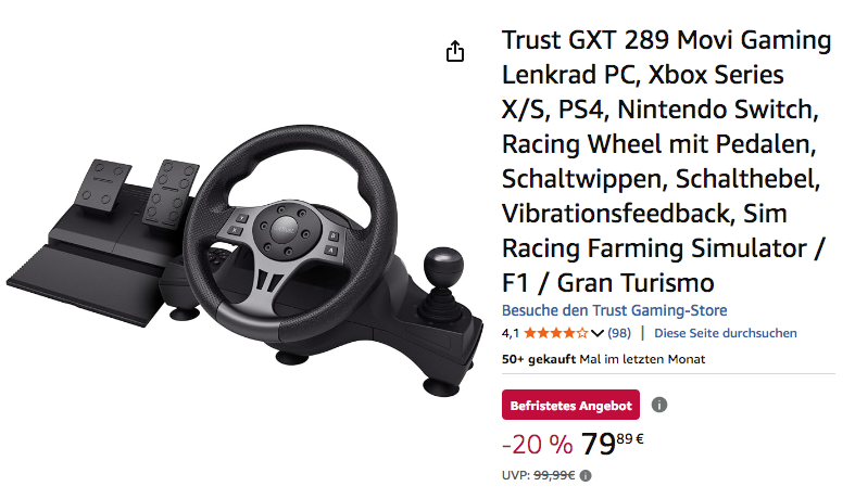 Amazon bietet aktuell das Trust GXT 289 Movi Gaming Lenkrad für 79,89€ an, solange der Vorrat reicht.