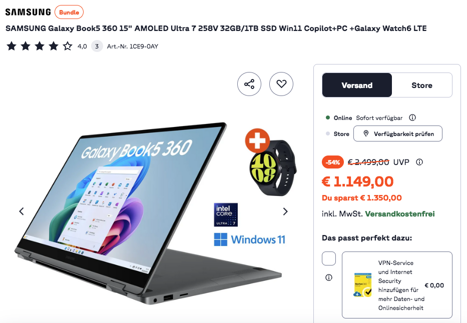 Das SAMSUNG Galaxy Book5 360 15" AMOLED Ultra 7 258V 32GB/1TB SSD Win11 Copilot+PC Notebook inkl. Galaxy Watch6 LTE bekommt man im Laufe dieser Aktion für 1149€ inkl. Versand.