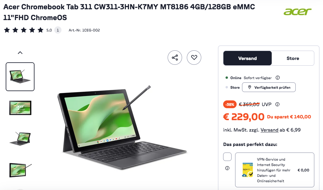 Das Acer Chromebook Tab 311 CW311-3HN-K7MY MT8186 4GB/128GB eMMC 11"FHD ChromeOS bekommt man im Laufe dieser Aktion für 229€ zzgl. 6,99€ Versand.