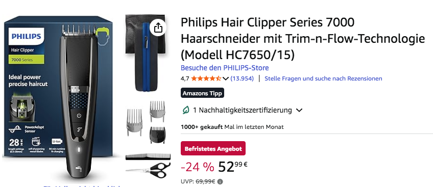 Amazon Kunden haben diesen zuverlässigen Haarschneider mit 4,7 Sternen benotet (13954 Bewertungen).