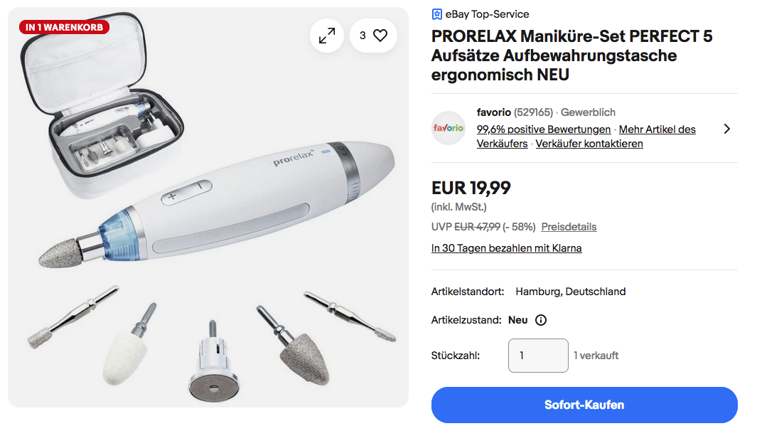 Favorio bietet aktuell bei eBay das PRORELAX Maniküre-Set PERFECT mit 5 Aufsätzen NEU&OVP für 19,99€ inkl. Versand an, solange der Vorrat reicht.