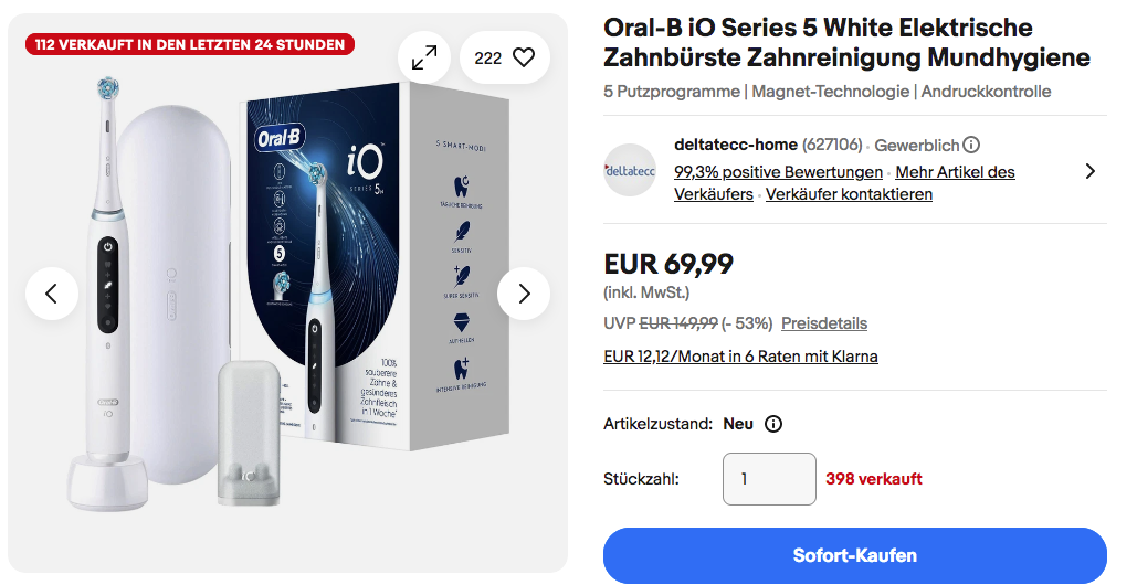 Deltatecc-home bietet aktuell bei eBay die Oral-B iO Series 5 White Elektrische Zahnbürste NEU&OVP für 69,99€ inkl. Versand an, solange der Vorrat reicht.