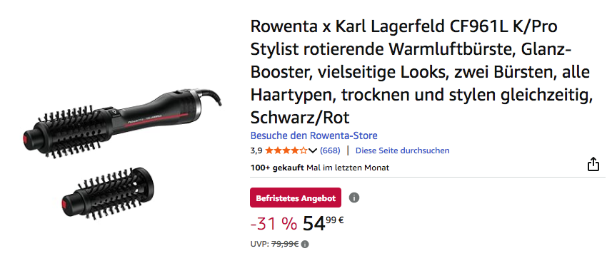 Amazon bietet aktuell die Rowenta x Karl Lagerfeld CF961L K/Pro Stylist rotierende Warmluftbürste in Schwarz/Rot für 54,99€ an, solange der Vorrat reicht.