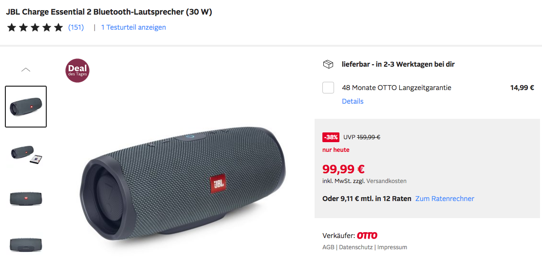 Otto.de bietet heute, 22.06.23, als Deal des Tages den JBL Charge Essential 2 Bluetooth-Lautsprecher in Grau für 99,99€ zzgl. 2,95€ Versand an, solange der Vorrat reicht.