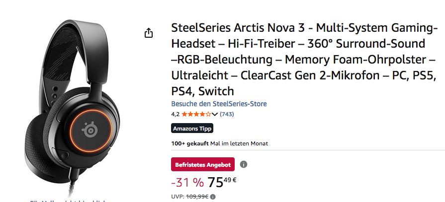Amazon bietet aktuell das SteelSeries Arctis Nova 3 - Multi-System Gaming-Headset für 75,49€ an, solange der Vorrat reicht.