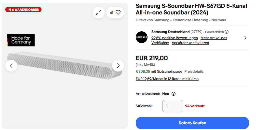 Dank dem Gutscheincode: SAMSUNGXMAS25 (5% Rabatt auf ausgewählte Samsung Artikel) bekommt man aktuell bei eBay die Samsung S-Soundbar HW-S67GD 5-Kanal All-in-one Soundbar in Weiß NEU&OVP für 208,05€ inkl. Versand an, solange der Vorrat reicht.