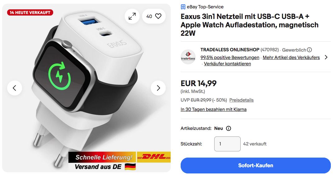 TRADE4LESS ONLINESHOP bietet aktuell bei eBay die Eaxus 3in1 Netzteil mit USB-C USB-A + Apple Watch Aufladestation NEU&OVP für 14,99€ inkl. Versand an, solange der Vorrat reicht.