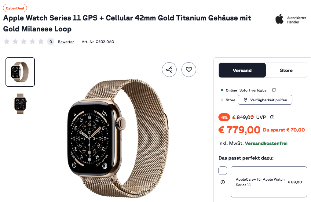 Die Apple MF8Y4ZR/A Watch Series 11 GPS + Cellular 42mm Gold Titanium Gehäuse mit Gold Milanese Loop bekommt man im Laufe dieser Aktion für 779€ inkl. Versand.