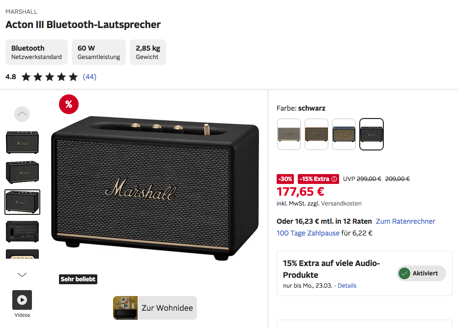 Otto.de - 15% Rabatt auf ausgewählte Audio-Produkte: z.B. MARSHALL Acton III Bluetooth-Lautsprecher in Schwarz