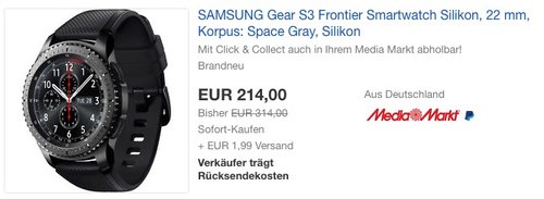MediaMarkt bietet bei Ebay die SAMSUNG Gear S3 Frontier Smartwatch NEU in den Größen S und L für 214€ zzgl. 1,99€ Versand an. SAMSUNG Gear S3 ist eine Top-Smartwatch, die mit robustem Äußeren und vielen Funktionen punktet. SAMSUNG Gear S3 Frontier Smartwatch:Optik einer klassischen Uhr Intuitive Bedienung über Lünette und seitliche Knöpfe Einfache Anpassung von Ziffernblatt und Armband an den eigenen Geschmack Erfassen von Laufwegen, Position und Geschwindigkeit über integriertes GPS MP3-Player und Lautsprecher für Musikgenuss ohne gekoppeltes Bluetooth Headset Trainingsaufzeichnung über Geschwindigkeits-, Höhen- und Luftdrucksensoren Schutz gegen Wasser und Staub (IP68) Diese Smartwatch wurde bei Amazon mit 4 Sternen bewertet (546 Kundenrezensionen)