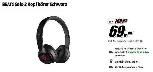 MediaMarkt bietet aktuell im Onlineshop und bei Ebay den BEATS Solo 2 Kopfhörer in Schwarz für 69€ bei einer Selbstabholung an, Versand kostet extra 4,99€. BEATS Solo 2 Kopfhörer:Leichtes Design für noch mehr Komfort und leicht zusammenfaltbar für den Einsatz unterwegs. Über das RemoteTalk Kabel kann man Anrufe entgegennehmen, den Titel wechseln und die Lautstärke regeln. Signalübertragung: kabelgebunden Anschlüsse: 1x 3.5 mm Klinke Gewicht: 205 g. Dieser Kopfhörer wurde von MediaMarkt Kunden mit 4,5 Sternen (57 Kundenrezensionen) und von Amazon Kunden mit 3,2 Sternen bewertet (412 Kundenrezensionen).