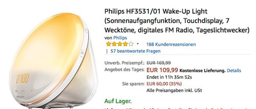 Amazon bietet heute, 16.01.18, als Tagesangebot den Philips HF3531/01 Wake-Up Light Wecker für 109,99€ an. Ein Wake-Up-Light-Wecker simuliert den Sonnenaufgang und verspricht ein sanftes Aufwachen auf natürliche Weise.Philips HF3531/01 Wake-Up Light Wecker:Stufenweise heller werdendes Licht in 5 Stufen – von sanften morgenrot zu natürlichem TageslichtDigitalwecker mit FM Radio oder 7 natürlichen Wecktönen, darunter 2 Naturgeräusche einstellbarDisplay mit automatischer Helligkeitseinstellung und innovativen Touch PadsDas Wake-up Light ist auch als Nachttischleuchte mit 10 individuellen Lichtintensitäten einsetzbarDiesen Wake-Up Light Wecker haben Amazon Kunden mit 3,9 Sternen (188 Kundenrezensionen).