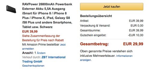 Dank dem Gutscheincode: I8FRNVTA (zeitlich befristet) bekommt man bei Amazon aktuell die RAVPower 26800mAh Powerbank für 29,99€ anstatt 39,99€. Die Powerbank ist eine universelle Energieversorgung für alle möglichen mobilen Geräte unterwegs. RAVPower 26800mAh Powerbank: Umwerfende Kapazität: 26.800 mAh, lädt iPhone 8 über 10 Mal, 8 Plus 7 Mal, Galaxy S6 über 6 mal, iPad Air 2 Mal Drei USB Ports mit kombinierten 5.5 A Ausgang Exklusive iSmart Technologie: Erkennt und liefert automatisch die optimale Ladestromstärke für jedes angeschlossene Gerät. Diese Powerbank wurde bei Amazon mit sehr guten 4,5 Sternen benotet (358 Kundenrezensionen). Verkauf durch ZBT International Trading GmbH und Versand durch Amazon.