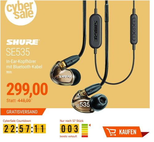 Cyberport bietet nur für kurze Zeit den Shure SE535 In Ear Kopfhörer in Bronze/Metallic + Shure BT1 Bluetooth Kabel für 299€ an (Gutschein: CYBERSALE), solange der Vorrat reicht. Der Shure SE535 In-Ear-Kopfhörer ist für die professionellen Ansprüchen gedacht, kann aber auch für privaten Musikgenuss gebraucht werden. Shure SE535 In-Ear-Kopfhörer:Dreiwege High-Definition MicroDriver – ein Hoch und zwei Tieftöner je KanalBesonders räumliches Klangbild mit druckvollem BassAbnehmbares Kabel, am Ohr drahtverstärkt und eine Auswahl an Zubehör für komfortablen Sitz und sicheren HaltOhrpassstücke in unterschiedlichen Größen und Materialien schirmen über 90 % der Umgebungsgeräusche abShure RMCE-BT1 Bluetooth Kabel:BT1 Bluetooth Kabel sorgt für stundenlangen Musikgenuss mit kabellosem Komfort und einfacher Steuerung.Drei-Tasten-Fernbedienung und integriertes Mikrofon für Anrufannahme, Sprachbefehle und die Nutzung von SprachassistentenKompatibel mit SE215, SE315, SE425, SE535 und SE846Bluetooth Version 4.1, Reichweite 10 MeterKevlar-verstärkt für längere Haltbarkeithttps://www.youtube.com/watch?v=GrN4DlLJEJEShure SE535 In Ear Kopfhörer wurde von Amazon Kunden mit 3,4 Sternen (49 Kundenrezensionen) und BT1 Bluetooth Kabel mit 3,7 Sternen bewertet (16 Kundenrezensionen).