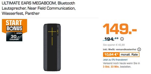 Saturn bietet aktuell im Laufe der START'WAS WOCHEN-Aktion den Ultimate Ears Megaboom Bluetooth Lautsprecher in Black Panther für 149€ inkl.Versand und zusätzlich 30€ Coupon für den nächsten Einkauf gratis dazu. Ultimate Ears MEGABOOM Bluetooth Lautsprecher:360-Grad-Sound Leistung (RMS): 36 W Schnelles und einfaches Pairing mit Smartphone, Tablet oder einem anderen Bluetooth-Gerät Freisprecheinrichtung Akkulaufzeit bis zu 20 Stunden IPX 7 wasserdicht Stoßfest Bluetooth, NFC Anschlüsse: 1x 3.5 mm Klinke, 1x Micro-USB https://www.youtube.com/watch?v=hbr4RM-icmwAmazon Kunden haben diesen Bluetooth Lautsprecher mit sattem Klang und hoher Lautstärke mit 4 Sternen bewertet (670 Kundenrezensionen)START'WAS WOCHEN-Aktion gültig bis zum 22.01.2018, 9 Uhr. Coupon nur einmalig ab einem Mindesteinkaufswert in Höhe des Couponwerts + 0,01 € und ab dem 21.02.2018 einlösbar.