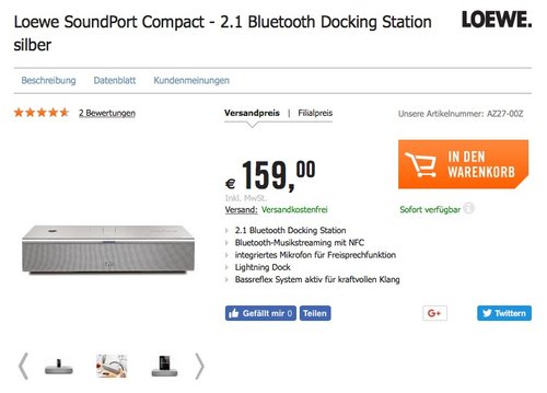 Der Loewe SoundPort Docking-Lautsprecher spielt Musik von zahlreichen Mobilgeräten wie z. B. iDevices, Android Smartphones oder Tablets ab.integriertes Mikrofon für Freisprechfunktion 80 Watt Musikgesamtleistung iOS, Android und Windows kompatibel Kopplung von Geräten via NFC Anschlüsse: USB-Eingang, AUX In Anschluss und Kopfhörer-Ausgang Maße in mm (B x H x T): 419 x109x178 Gewicht: 3,5 Kg Auch in schwarz verfügbar. 5 Sterne bei Amazon (5 Bewertungen).