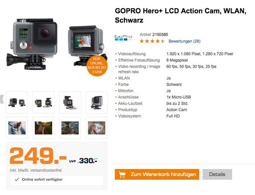 GOPRO Hero+ LCD Action Cam: Videoauflösung: 1.920 x 1.080 Pixel, 1.280 x 720 Pixel Effektive Fotoauflösung: 8 Megapixel Video recording / image refresh rate: 60 fps, 50 fps, 30 fps,25 fps WLAN: Ja Farbe: Schwarz Mikrofon: Ja Anschlüsse: 1x Micro-USB Verfügt über Wi-Fi und Bluetooth 4,6 Sterne bei Saturn (28 Bewertungen).Saturn Late Night Shopping (gültig von Mi. 20 Uhr bis Do. 9 Uhr, nur online und nur solange der Vorrat reicht)