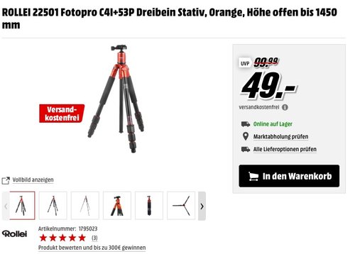 MediaMarkt - Foto-Nacht ab Acht- Foto Angebote von 20 bis 9 Uhr. Bauform:Dreibein Höhe offen:1560 mm Stativkopf:Kugelkopf Höhe geschlossen:430 mm Besondere Merkmale:Monopodfunktion, Beine 180° schwenkbar, teilbare und drehbare Mittelsäule für Makrofotografie 4,6 Sterne bei Amazon (463 Bewertungen), 4,5 Sterne bei MediaMarkt (7 Bewertungen).