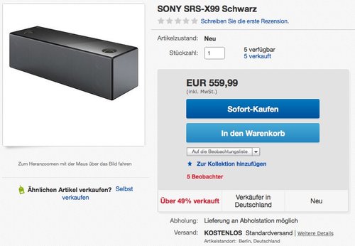 Sony SRS-X99 ist ein 2.1-Kanal-Lautsprechersystem mit 154 W kraftvollen Sound. Zwei Ferrofluid-Lautsprecher sorgen für eine klare und brillante Wiedergabe von Stimmen und komplexen Melodien, während WD-Superhochtöner ausdrucksstarke Höhen und ein breites Klangspektrum reproduzieren. Bluetooth; NFC-Verbindung mit Freisprechfunktion; WiFi: Direkter Zugriff auf Musik-Streaming-Dienste. 4,4 Sterne bei Amazon (13 Bewertungen).