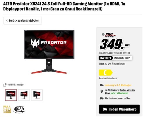 Der Acer Predator XB241 ist ein 24,5" (62 cm) Gamingmonitor mit Nvidia Gsync, mattem ComfyView Display, 144Hz Bildwiederholrate und 1ms Reaktionszeit. Panel-Technologie: Twisted Nematic Film (TN Film) und Full HD. 4,1 Sterne bei Amazon (149 Bewertungen). Marktabholung ist kostenlos, sonst 4,99 Euro Versand.