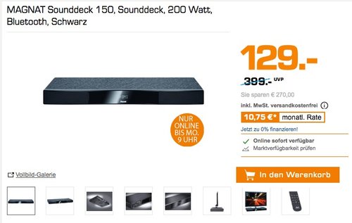 Saturn Super Sunday (gültig von Samstag 20 Uhr bis Montag 9 Uhr, nur online und nur solange der Vorrat reicht). Das Sounddeck 150 bietet vollwertigen, dynamischen Heimkino-Sound und eine umfangreiche Ausstattung. Der integrierte Downfire-Subwoofer sorgt für ein kraftvolles Tieftonfundament, zwei vollwertige Stereo-Systeme auf der Front garantieren exzellente Stimmenverständlichkeit und hohe Detailauflösung. 4,1 Sterne bei Amazon (14 Bewertungen).