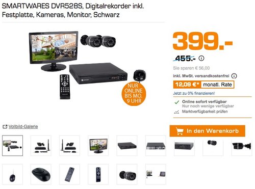 Saturn Super Sunday (gültig von Samstag 20 Uhr bis Montag 9 Uhr, nur online und nur solange der Vorrat reicht). Livebetrachtung oder Aufzeichnung über Monitor oder TV möglich. Weltweite Livebetrachtung oder Aufzeichnungen über Smartphone oder PC. Bewegungserkennung. 24 Stunden Aufzeichnung. Lieferumfang: 8-Kanal Digitalrekorder, Festplatte, 2x Kamera, Monitor, Maus, Fernbedienung, Bedienungsanleitung. 4 Sterne bei Amazon (3 Bewertungen).