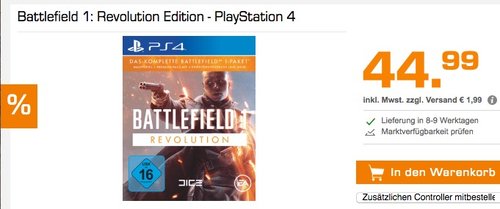 Mit Battlefield 1 Revolution taucht man in den Ersten Weltkrieg ein und nimmt an epischen teambasierten Multiplayer-Schlachten teil oder entdeckt in den Kriegsgeschichten der Kampagne eine Welt im Krieg. Battlefield 1: Revolution Edition - PlayStation 4 enthält das Battlefield 1-Hauptspiel und den Battlefield 1 Premium-Pass* mit vier Erweiterungspacks und bietet somit ein umfassendes Komplettpaket. Abholung ist kostenlos, sonst 1,99€ Versandkosten.