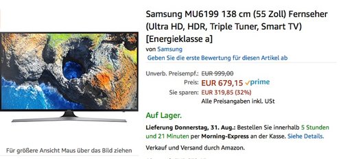 Samsung MU6199 138 cm (UE55MU6199) ist eine Neuerscheinung in Fernseher bei Amazon. Auflösung: 3.840 x 2.160 Pixel (Ultra HD). Abmessungen (cm): 6,32 x 71,84 x 124. Bildwiederholfrequenz: 1300 Hz GHz. Unterstütze Streaming-Dienste: Amazon Video, Netflix, Zattoo, Youtube, Maxdome, ARD, DAZN, Gamefly, Ran, Videoland, Videociety, Wuaki, Prosieben Apps, uvm.