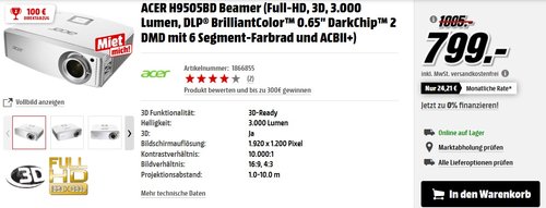 100 Euro Direktabzug im Warenkorb. Der Acer H9505BD Full-HD ist ein heller High End Wohnzimmer-Projektor und bietet absolut flimmerfreies 3D an. Betriebsdauer Lampe (Normal/Eco): 3000 Std. / 4000 Std. Bildschirmauflösung: 1.920 x 1.200 Pixel. 4,1 Sterne bei Amazon (29 Bewertungen).