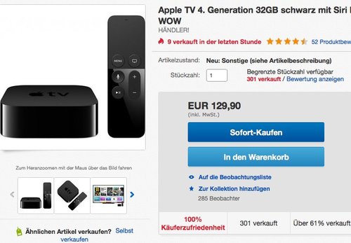 Dieser Alleinunterhalter bietet hohe Bildqualität, große Programmauswahl und einfache Bedienung. Wer mit dem iPhone fotografiert, die iCloud nutzt oder HomeKit-Geräte installiert, profitiert von Extras, die Apple TV 4 im Vergeleich zu den anderen Playern anbietet. Laut dem Anbieter ist Zustand wie neu, keine Gebrauchsspuren und im Originalverpackung mit Originalzubehör.