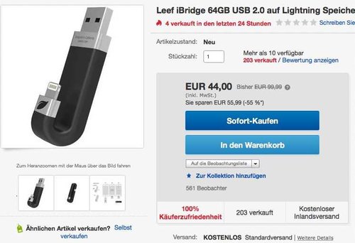 Leef - iBridge Mobile Memory 64GB ist eine Speicherlösung mit Lightning für iPad, iPhone und iPod. Mit Gratis-App können die Fotos und Videos direkt auf die iBridge 3 aufgenommen werden. Ideal für Datentransfer zwischen iOS, Mac und PC. Kompatibilität: iPod touch (5. Gen.), iPhone 5/5s/5c und 6/6 Plus, iPad (4. Gen.), iPad mit Retina Display, iPad mini/2/3, iPad Air/2. 3,8 Sterne bei Amazon (94 Bewertungen).
