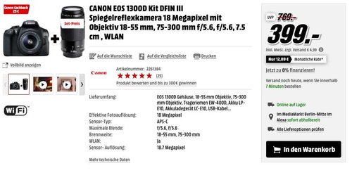 CANON EOS 1300D Kit Spiegelreflexkamera inkl. 18-55 mm und 75-300 mm Objektiv. Zusätzlich 25 Euro Cashback, mehr Infos unter: https://www.canon.de/sommer/. Bestseller bei Amazon, 4,6 Sterne (75 Bewertungen). Abholung in einer Filiale ist kostenlos, sonst 4,99 Euro Versandkosten fällig.
