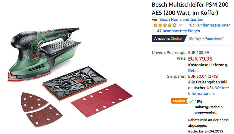 Dank dem 15% Rabattgutschein (Coupon anklicken und der Rabatt wird automatisch beim Kauf an der Kasse abgezogen) bekommt man bei Amazon bis zum 24.4.19 den Bosch Multischleifer PSM 200 AES für 129,99€ inkl. Versand, solange der Vorrat reicht.