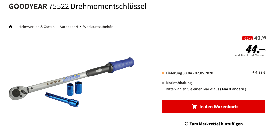 MediaMarkt bietet bis zum 21.04.20 im Laufe der aktuellen Prospekt - Aktion unter anderem den GOODYEAR 75522 1/2" 42 - 210 Nm Drehmomentschlüssel für 44€ inkl. Versand an, solange der Vorrat reicht.