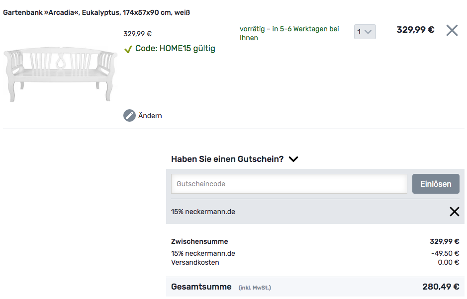 Neckermann.de bietet bis zum 24.04.20 mit dem Gutscheincode: HOME15 einen 15 % Rabatt und Gratis-Lieferung auf ausgewählte Artikel aus dem Einrichtungs-, Mode-, Baumarkt- und Freizeitsortiment an.