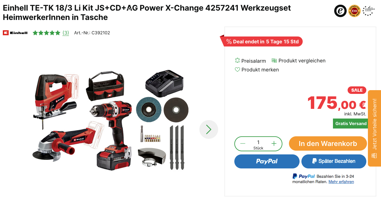 Das Einhell TE-TK 18/3 Li Kit JS+CD+AG Power X-Change 4257241 Werkzeugset bekommt man im Laufe dieser Aktion für 175€ inkl. Versand.