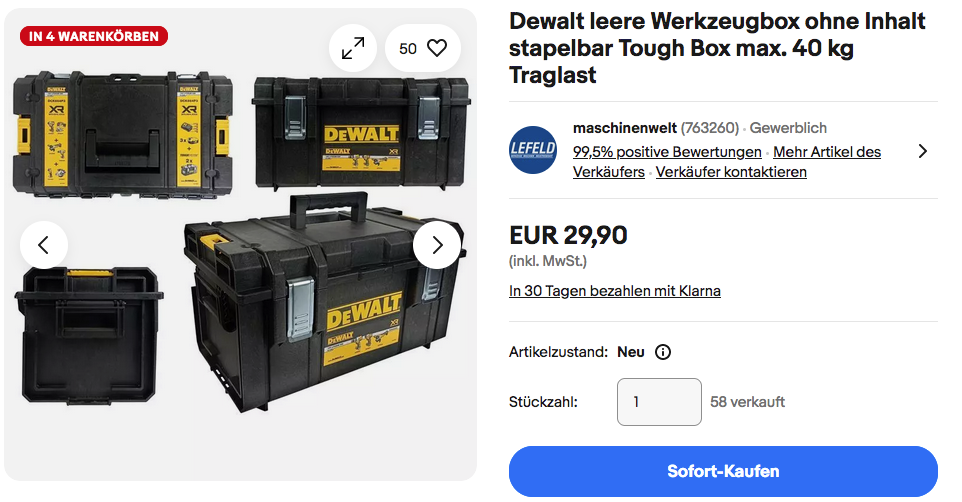Maschinenwelt bietet aktuell bei eBay die DEWALT Tough Box Werkzeugbox/ Werkzeugkiste DS300 NEU&OVP für 29,90€ inkl. Versand an, solange der Vorrat reicht.