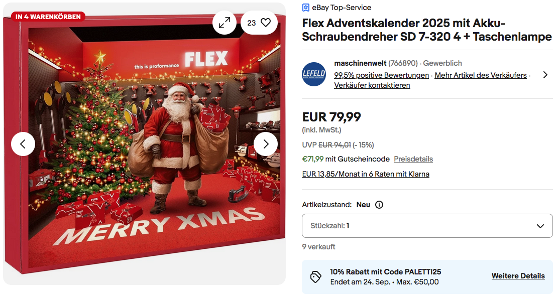 Den Flex Adventskalender 2025 mit Akku-Schraubendreher SD 7-320 4 + Taschenlampe NEU&OVP bekommt man im Laufe dieser Aktion für 71,99€ inkl. Versand an, solange der Vorrat reicht.