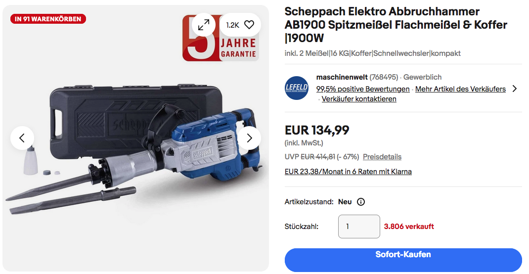 Maschinenwelt bietet aktuell bei eBay den Scheppach AB1900 Elektro Abbruchhammer NEU&OVP für 134,99€ inkl. Versand an, solange der Vorrat reicht.