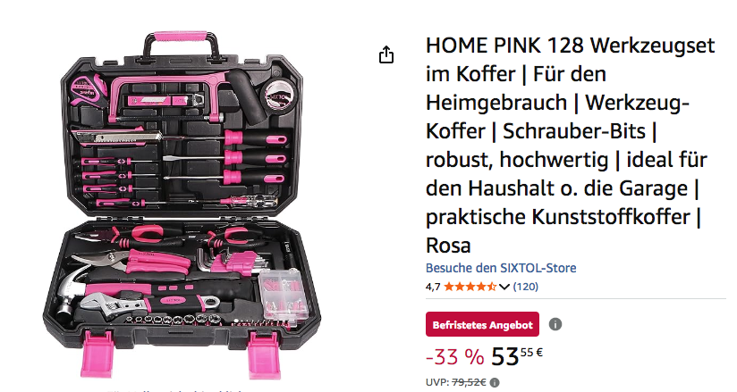 Amazon bietet aktuell das HOME PINK 128 Werkzeugset im Koffer für 53,55€ an, solange der Vorrat reicht.