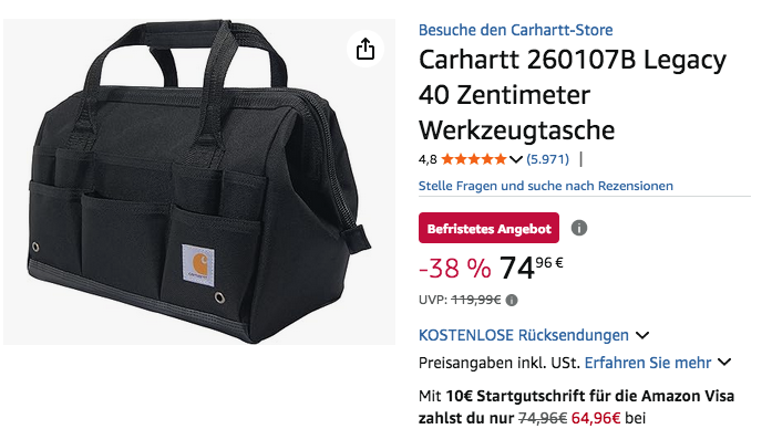 Amazon bietet aktuell die Carhartt 260107B 40 Zentimeter Werkzeugtasche in Schwarz für 74,96€ an, solange der Vorrat reicht.