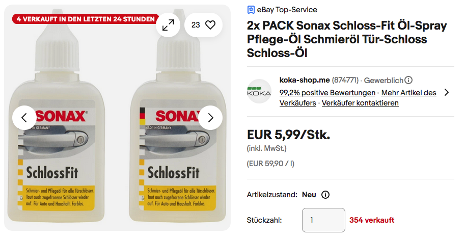 Koka-shop.me bietet aktuell bei eBay den 2x PACK Sonax Schloss-Fit Öl-Spray NEU&OVP für 5,99€ inkl. Versand an, solange der Vorrat reicht.